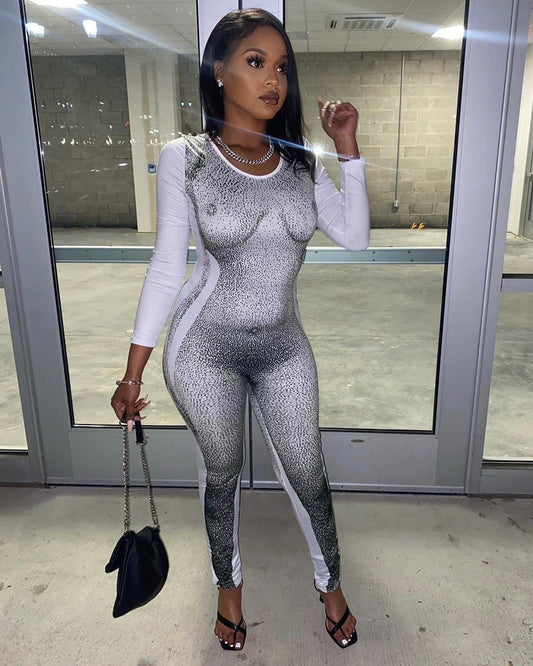 BLACK Long Sleeve Printed Bodycon Jumpsuit